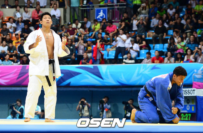 21일 오전 인천 도원체육관에서 열린 제17회 인천 아시안게임 유도 남자 81kg 16강전에서 김재범이 8강 진출 확정 후 기도를 하고 있다.