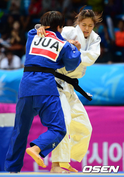 21일 오전 인천 도원체육관에서 열린 제17회 인천 아시안게임 유도 여자 63kg 예선에서 정다운이 경기를 펼치고 있다.