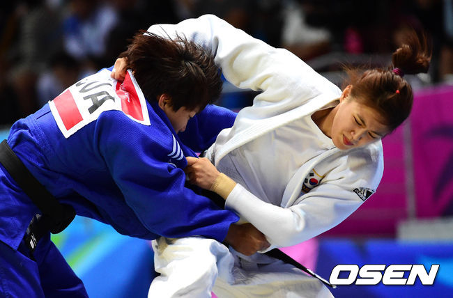 21일 오전 인천 도원체육관에서 열린 제17회 인천 아시안게임 유도 여자 63kg 예선에서 정다운이 경기를 펼치고 있다.