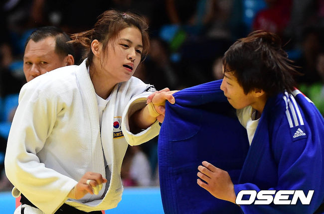 21일 오전 인천 도원체육관에서 열린 제17회 인천 아시안게임 유도 여자 63kg 예선에서 정다운이 경기를 펼치고 있다.