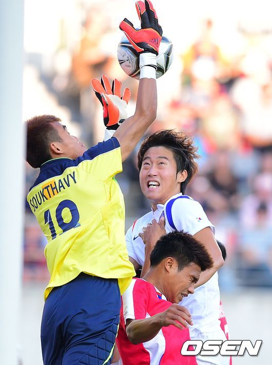 21일 오후 경기도 화성종합경기타운에서 열린 2014 인천 아시안게임 축구 A조 조별리그 2차전 한국과 라오스의 경기, 전반 이용재가 라오스 골키퍼의 선방에 골찬스를 놓치고 있다.