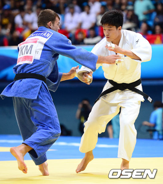 21일 오전 인천 도원체육관에서 열린 제17회 인천 아시안게임 유도 남자 73kg 예선에서 북한 홍국현이 경기를 펼치고 있다.