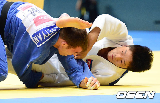 21일 오전 인천 도원체육관에서 열린 제17회 인천 아시안게임 유도 남자 73kg 예선에서 북한 홍국현이 경기를 펼치고 있다.