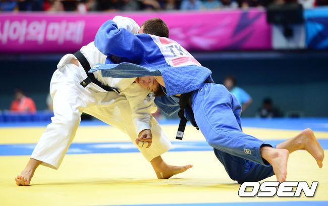 21일 오전 인천 도원체육관에서 열린 제17회 인천 아시안게임 유도 남자 73kg 예선에서 북한 홍국현이 경기를 펼치고 있다.