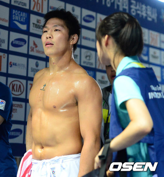 21일 오전 인천 도원체육관에서 열린 제17회 인천 아시안게임 유도 남자 81kg 예선을 마친 김재범이 북한 홍국현의 경기를 지켜보고 있다.