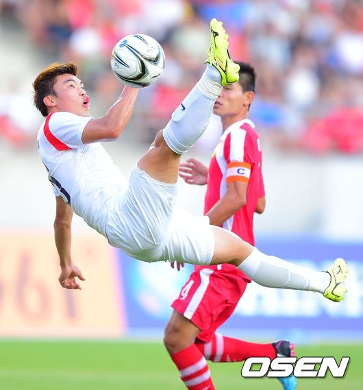 21일 오후 경기도 화성종합경기타운에서 열린 2014 인천 아시안게임 축구 A조 조별리그 2차전 한국과 라오스의 경기, 전반 이종호가 오버헤드킥을 시도하고 있다. 골로 들어갔지만 오프사이드 판정되며 노골선언.