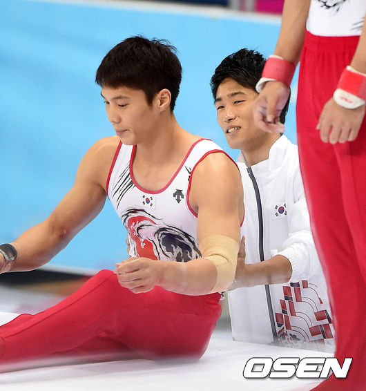 양학선이 안마에 출전하는 동료들을 격려하고 있다.