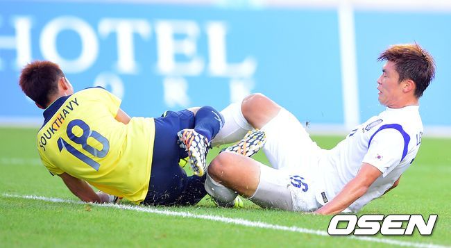 21일 오후 경기도 화성종합경기타운에서 열린 2014 인천 아시안게임 축구 A조 조별리그 2차전 한국과 라오스의 경기, 전반 이종호가 라오스 골키퍼와 충돌하며 쓰러지고 있다