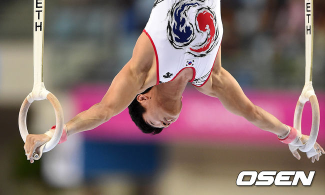 한국 양학선이 링 연기를 펼치고 있다.