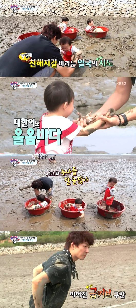 21일 오후 방송된 KBS 2TV 예능프로그램 '해피선데이-슈퍼맨이 돌아왔다'에서는 갯벌을 체험하기 위해 세 쌍둥이를 데리고 나온 송일국의 모습이 그려졌다.