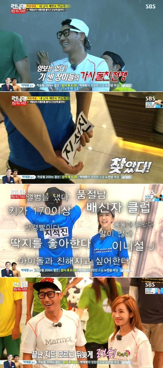 이에 두 사람을 비롯한 나머지 멤버들은 ‘앨범을 냈다’, ‘품절남’, ‘아이돌과 친해지고 싶어한다’, ‘이니셜 J’, ‘안경빨이다’ 등의 힌트에 따라 지석진을 후보로 지목, 이름표 찾기 전쟁에 돌입했다.