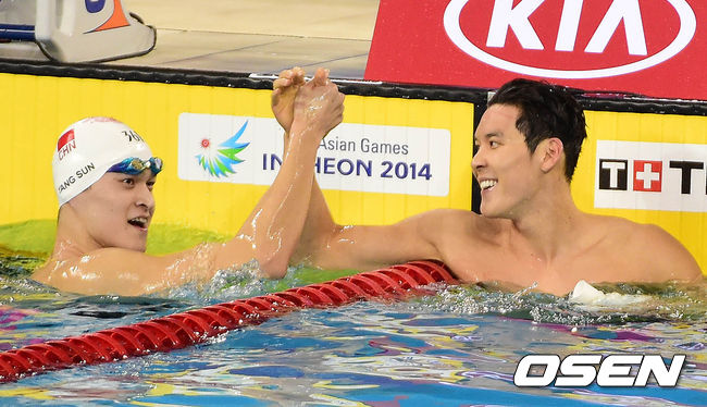 21일 오후 인천 문학박태환수영장에서 열린 제17회 인천 아시안게임 남자 자유형 200m 결승 종료 후 박태환과 쑨양이 하이파이브를 하고 있다.