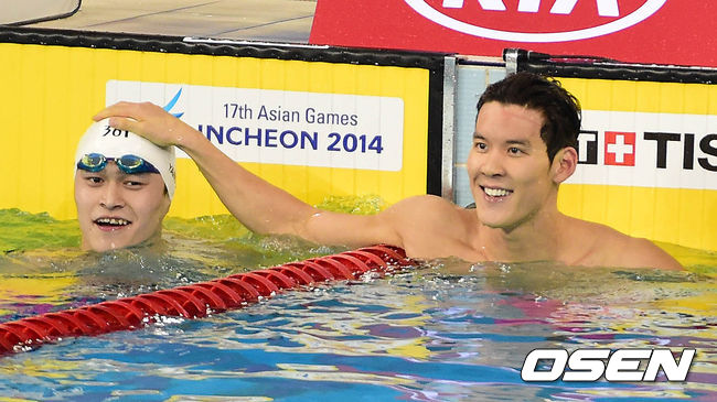 21일 오후 인천 문학박태환수영장에서 열린 제17회 인천 아시안게임 남자 자유형 200m 결승 종료 후 박태환이 쑨양의 머리를 쓰다듬고 있다.
