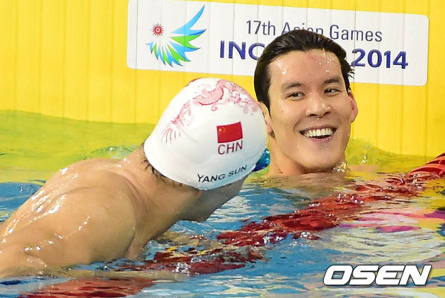 21일 오후 인천 문학박태환수영장에서 열린 제17회 인천 아시안게임 남자 자유형 200m 결승 종료 후 박태환이 쑨양을 바라보며 미소를 짓고 있다.