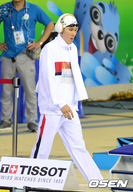 21일 오후 인천 문학박태환수영장에서 열린 제17회 인천 아시안게임 남자 자유형 200m 결승에 박태환이 입장하고 있다.