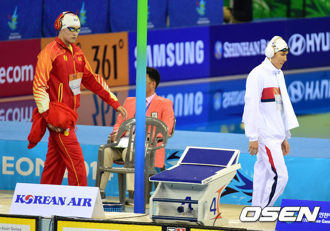 21일 오후 인천 문학박태환수영장에서 열린 제17회 인천 아시안게임 남자 자유형 200m 결승에 박태환과 쑨양이 입장하고 있다.