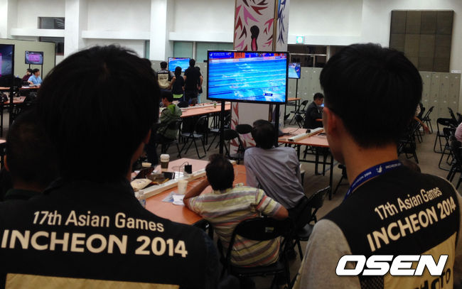 이날 인천 문학박태환수영장에서 열린 경기는 MPC에 설치된 여러 TV를 통해 방송됐다. 박태환과 쑨양의 맞대결로 일찌감치 알려졌기 때문인지 한국과 중국 기자들이 TV 앞으로 우선 몰렸다. 하지만 다른 국가 기자들도 관심을 보이며 TV 앞에 몰려 결과를 지켜봤다.