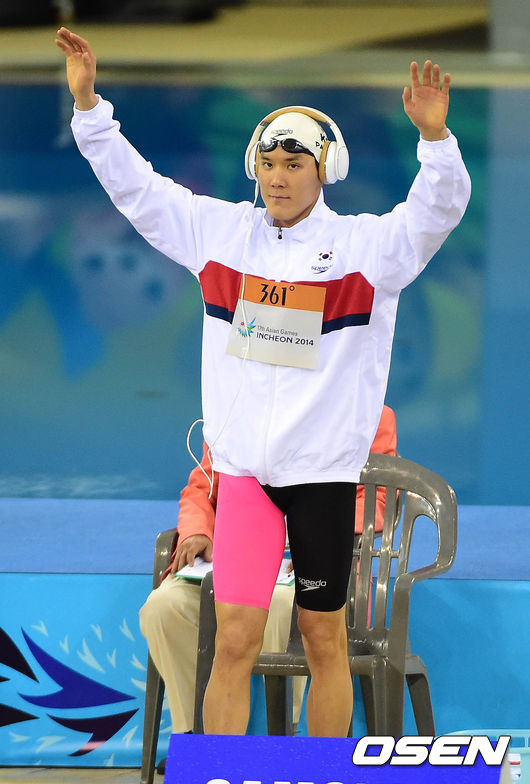 21일 오후 인천 문학박태환수영장에서 열린 제17회 인천 아시안게임 남자 자유형 200m 결승 시작전 박태환이 관중들에게 인사를 하고 있다.