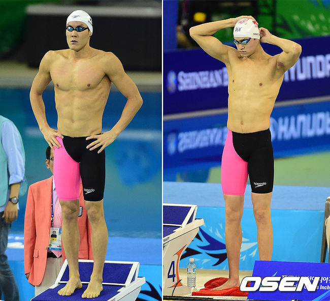 21일 오후 인천 문학박태환수영장에서 열린 제17회 인천 아시안게임 남자 자유형 200m 결승에 박태환과 쑨양이 같은 수영복을 입고 나와 눈길을 끌고 있다.