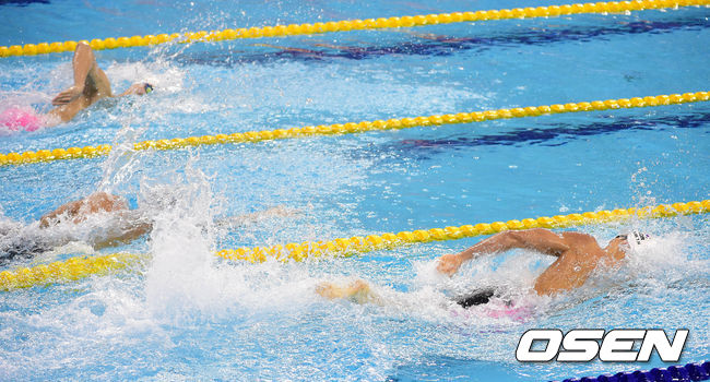 21일 오후 인천 문학박태환수영장에서 열린 제17회 인천 아시안게임 남자 자유형 200m 결승 (위부터) 쑨양, 하기노 고스케, 박태환이 경기를 펼치고 있다.
