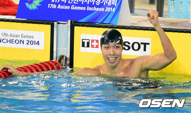 21일 오후 인천 문학박태환수영장에서 열린 제17회 인천 아시안게임 남자 자유형 200m 결승에서 1위를 차지한 하기노 고스케가 기뻐하고 있다.