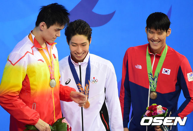 21일 오후 인천 문학박태환수영장에서 열린 제17회 인천 아시안게임 남자 자유형 200m 결승 시상식에서 금메달을 차지한 하기노 고스케(가운데)와 박태환(동메달)이 미소를 짓고 있다.