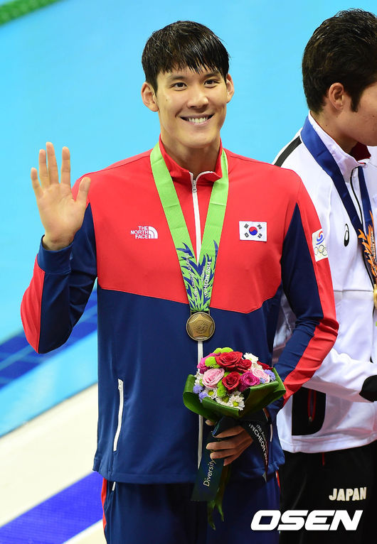 21일 오후 인천 문학박태환수영장에서 열린 제17회 인천 아시안게임 남자 자유형 200m 결승 시상식에서 동메달을 차지한 박태환이 미소를 짓고 있다.