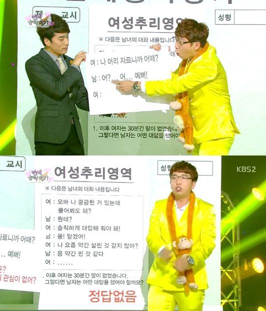 이어 정범균은 “이와 함께 여친의 3대 질문이 있다”라며 ‘오빠 나 화장 이상하지’ ‘오빠 나 머리 자르니까 어때?’라는 등의 질문을 사례로 들었다.