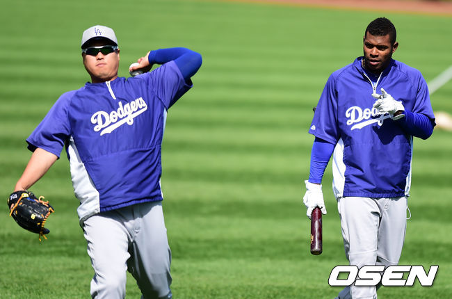 22일(이하 한국시간) 미국 일리노이주 시카고 리글리 필드에서 열린 '2014 메이저리그' LA 다저스와 시카고 컵스의 경기, 경기에 앞서 다저스 류현진이 캐치볼을 하자 이를 지켜보던 푸이그가 장난을 치고 있다.