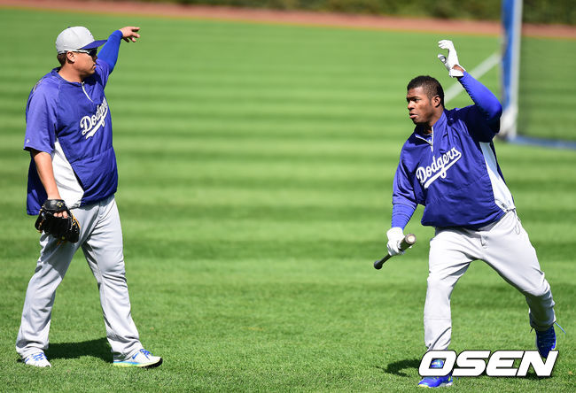 22일(이하 한국시간) 미국 일리노이주 시카고 리글리 필드에서 열린 '2014 메이저리그' LA 다저스와 시카고 컵스의 경기, 경기에 앞서 다저스 류현진이 캐치볼을 하자 이를 지켜보던 푸이그가 장난을 치고 있다.