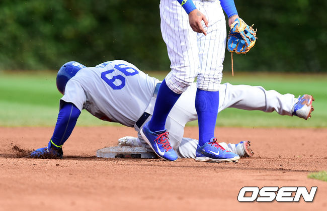 22일(이하 한국시간) 미국 일리노이주 시카고 리글리 필드에서 열린 '2014 메이저리그' LA 다저스와 시카고 컵스의 경기, 5회초 무사 1루에서 2루 도루를 시도한 다저스 푸이그가 슬라이딩을 하며 다리를 삐긋하고 있다.