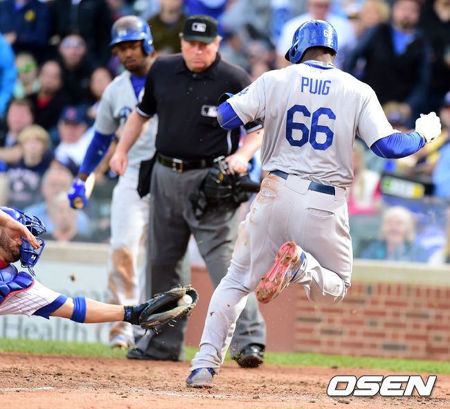 22일(이하 한국시간) 미국 일리노이주 시카고 리글리 필드에서 열린 '2014 메이저리그' LA 다저스와 시카고 컵스의 경기, 5회초 2사 2루에서 다저스 푸이그가 맷 켐프의 1타점 좌전 적시타에 컵스 카스티요의 태그를 피해 홈에서 세이프되고 있다.