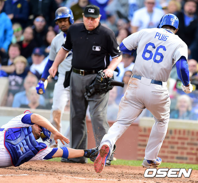 22일(이하 한국시간) 미국 일리노이주 시카고 리글리 필드에서 열린 '2014 메이저리그' LA 다저스와 시카고 컵스의 경기, 5회초 2사 2루에서 다저스 푸이그가 맷 켐프의 1타점 좌전 적시타에 컵스 카스티요의 태그를 피해 홈에서 세이프되고 있다.
