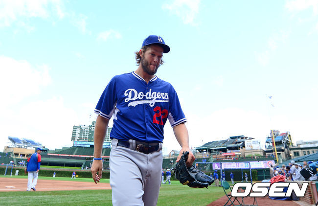 22일(이하 한국시간) 미국 일리노이주 시카고 리글리 필드에서 열린 '2014 메이저리그' LA 다저스와 시카고 컵스의 경기, 경기에 앞서 다저스 커쇼가 훈련을 마치고 더그아웃으로 향하고 있다.
