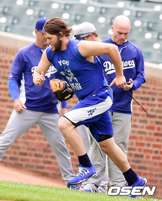 22일(이하 한국시간) 미국 일리노이주 시카고 리글리 필드에서 열린 '2014 메이저리그' LA 다저스와 시카고 컵스의 경기, 경기에 앞서 다저스 커쇼가 러닝을 하며 몸을 풀고 있다.