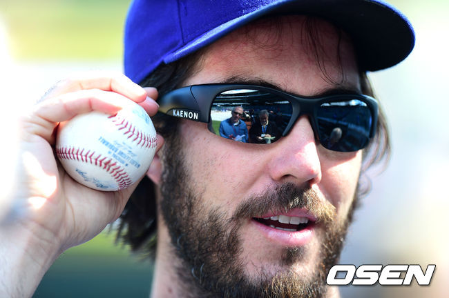 22일(이하 한국시간) 미국 일리노이주 시카고 리글리 필드에서 열린 '2014 메이저리그' LA 다저스와 시카고 컵스의 경기, 경기에 앞서 다저스 댄 하렌이 취재진과 인터뷰를 하고 있다.