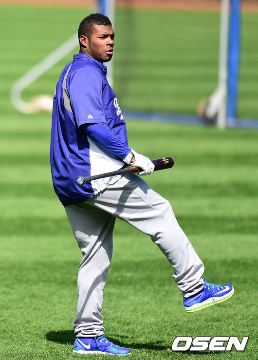 22일(이하 한국시간) 미국 일리노이주 시카고 리글리 필드에서 열린 '2014 메이저리그' LA 다저스와 시카고 컵스의 경기, 경기에 앞서 다저스 류현진이 캐치볼을 하자 이를 지켜보던 푸이그가 류현진의 투구폼을 따라하며 장난을 치고 있다.