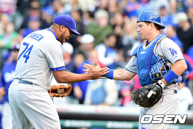 9회말 2사 2,3루에서 다저스 잰슨이 컵스 발부에나를 삼진으로 처리하고 엘리스와 승리를 기뻐하고 있다. /jpnews@osen.co.kr