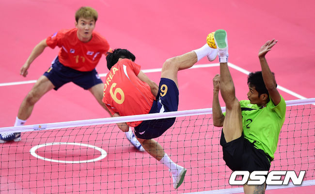 22일 오후 부천시 부천체육관에서 열린 제17회 인천 아시안게임 세팍타크로 남자 더블 결승전 한국과 미얀마의 경기, 김영만이 브로킹을 하고 있다.