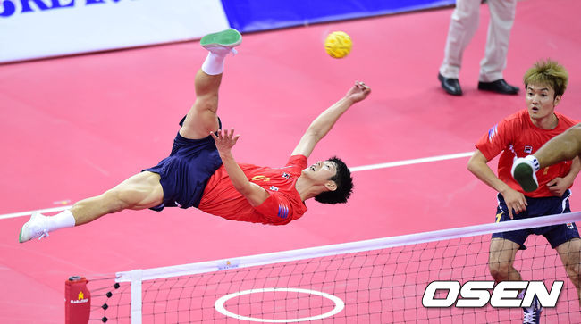 22일 오후 부천시 부천체육관에서 열린 제17회 인천 아시안게임 세팍타크로 남자 더블 결승전 한국과 미얀마의 경기, 김영만이 공격을 시도하고 있다.