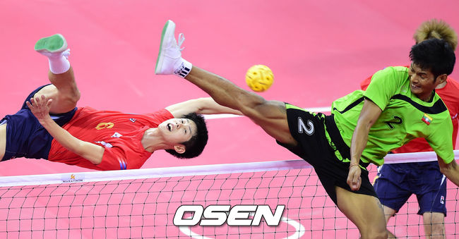 22일 오후 부천시 부천체육관에서 열린 제17회 인천 아시안게임 세팍타크로 남자 더블 결승전 한국과 미얀마의 경기, 김영만이 공격을 시도하고 있다.