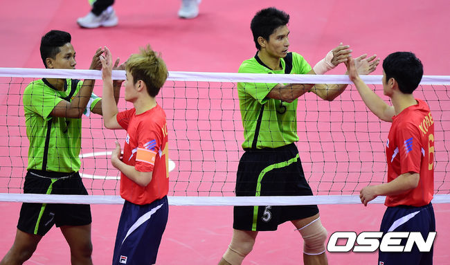 22일 오후 부천시 부천체육관에서 열린 제17회 인천 아시안게임 세팍타크로 남자 더블 결승전 한국과 미얀마의 경기 종료 후 정원덕-김영만이 미얀마 선수들과 하이파이브를 하고 있다.