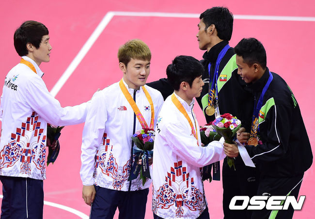 김영만(28, 청주시청), 정원덕(26, 고양시청), 임안수(26, 고양시청)가 출전한 한국은 22일 경기도 부천체육관에서 열린 2014 인천 아시안게임 남자 세팍타크로 더블 결승에서 미얀마에 세트스코어 0-2(19-21 18-21)로 패했다. 이로써 한국은 2대회 연속 미얀마의 벽을 넘지 못하고 은메달에 머물렀다. / baik@osen.co.kr