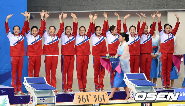 22일 오후 인천 문학동 문학박태환수영장에서 열린 2014 인천아시안게임 싱크로나이즈스위밍 여자 단체 자유종목 결승전, 동메달을 획득한 북한 대표팀이 시상대에서 손을 흔들고 있다.