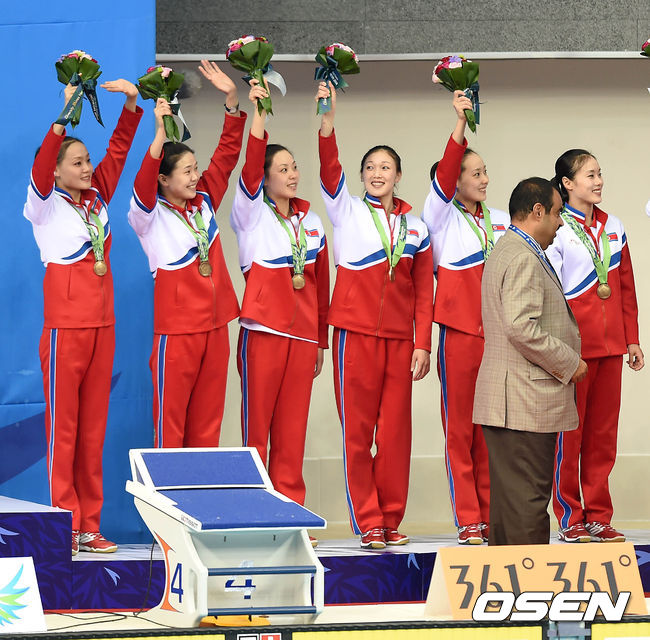 22일 오후 인천 문학동 문학박태환수영장에서 열린 2014 인천아시안게임 싱크로나이즈스위밍 여자 단체 자유종목 결승전, 동메달을 획득한 북한 대표팀이 시상대에서 손을 흔들고 있다.