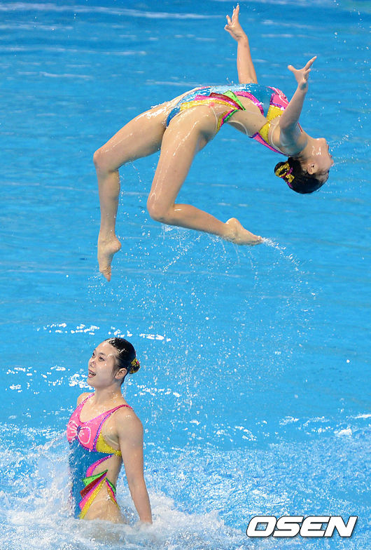 22일 오후 인천 문학동 문학박태환수영장에서 열린 2014 인천아시안게임 싱크로나이즈스위밍 여자 단체 자유종목 결승전, 북한 싱크로나이즈 대표팀이 멋진 연기를 펼치고 있다.