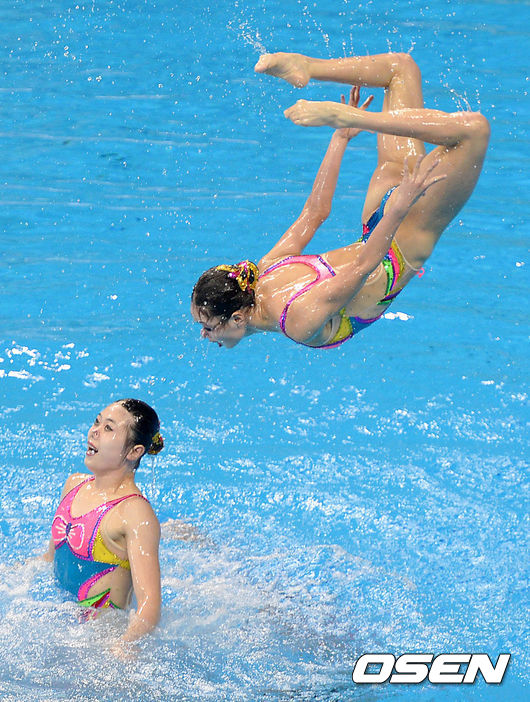 22일 오후 인천 문학동 문학박태환수영장에서 열린 2014 인천아시안게임 싱크로나이즈스위밍 여자 단체 자유종목 결승전, 북한 싱크로나이즈 대표팀이 멋진 연기를 펼치고 있다.