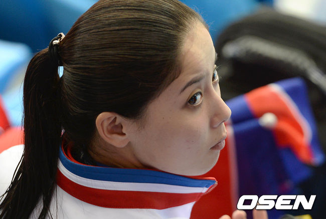 북한 싱크로나이즈 대표팀 김우나가 관중석에서 응원을 하고 있다. /sunday@osen.co.kr