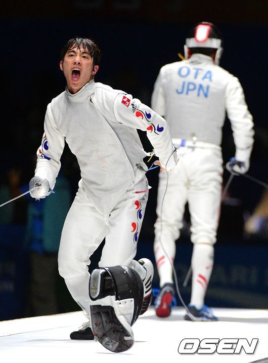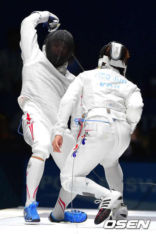 분위기를 내준 오타는 물을 마시며 전열을 가다듬었다. 피스트엔 전운이 감돌았다. 허준이 다시 한 번 오타의 몸통을 기습적으로 노리며 13-9로 리드, 승기를 잡는 듯했다. 허준은 2라운드를 13-10으로 앞선 채 마쳤다. 3라운드 초반 다시 위기를 맞았다. 39초 만에 13-13으로 동점을 허용했다. 위기의 순간 허준의 칼끝이 번뜩였다. 상대보다 먼저 목을 찔러 귀중한 득점을 얻었다. 허준은 이후 2점을 내줘 패할 위기에 몰렸지만 비디오 판독 결과 번복, 마지막 기회를 잡았다. 허준은 결국 회심의 마지막 공격을 성공시킨 뒤 칼을 집어던지며 포효했다.