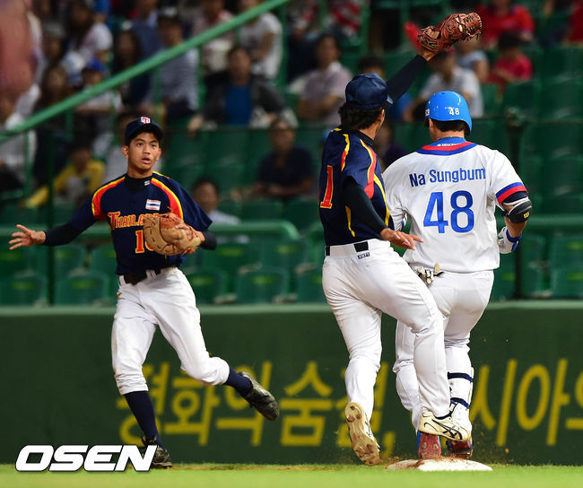 나성범은 1-0으로 리드한 1회 2사 2·3루 첫 타석에서 태국 선발 시하맛을 상대로 1루 내야 안타를 치고 나가며 3루 주자 김현수를 홈으로 불러들였다. 1루 라인으로 다소 깊은 타구에 태국 투수 시하맛의 베이스 커버가 늦었지만, 나성범의 전력 질주가 아니면 아웃이 될 수 있는 타구였다. 나성범의 내야안타를 발판삼아 한국은 1회에만 대거 8득점하며 기선제압에 성공했다.